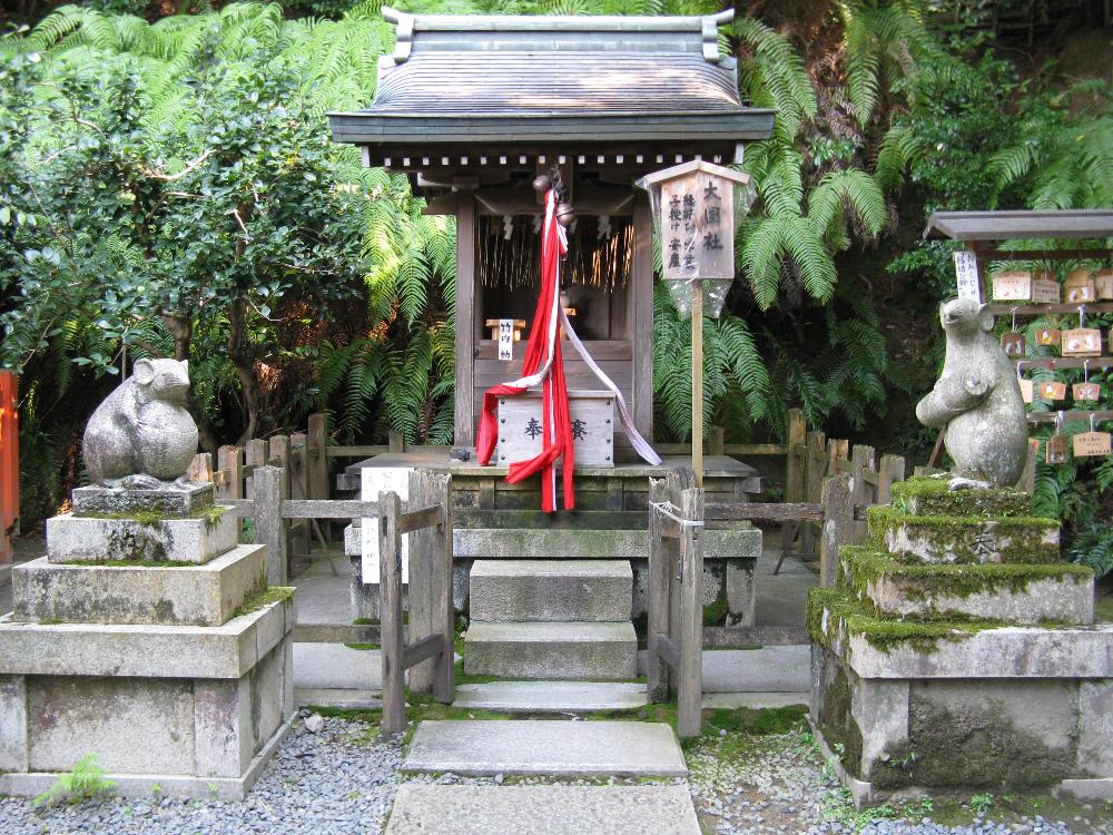 We keep on walking along the path, a Torii made by stone (an entrance gate) to the Otoyo-jinja shrine appears at a residential district. As we walk through the torii, the path to the shrine becomes narrower. The guardians of the shrine are neither the fox nor the raven, but mice! Mice guardians are made in 1960s based on "Kojiki (The records of ancient matters in Japan)", it says that a mouse saved the life of the deity Okuninushi when he trapped in a room on fire. This shrine is today synonymous with longevity and good health, and would date from the 9th century.