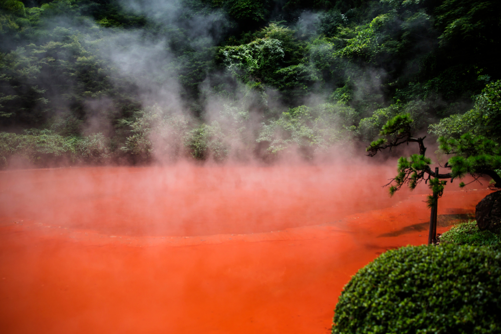 It's over 1,300 years old, and it's the oldest Jigoku in Beppu. This hot spring contains suspended clay that gives it an impressive red color. Formerly used clay mud tinged with red to make skin remedies or dye clothes.