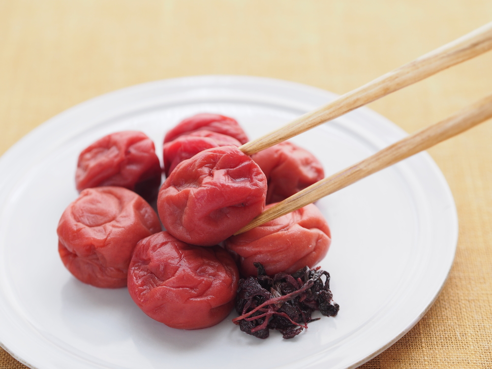 It is the ume fruit (Japanese apricot) fermented by the salt and shiso red leaves (which gives the aroma and the colour to the foods) in the barrel. They are dried after the fermentation and often eaten with rice. The taste is very acid and salty so that the Europeans often surprised at them! They have very little calories and rich in manganese, in potassium and in fibre. They are very good for the liver, for the digestion and for the prevention of the cancer.