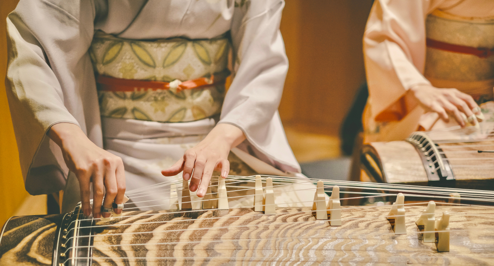 The Koto, also a string instrument, the koto is often called "Japanese Harp" because of the similar sounds it produces. Introduced from China to Japan in the 12th century, he was popular at the Imperial Court and often accompanies Kabuki or Bunraku shows. Measuring in general about 1m80 and counting usually 13 strings, it requires great dexterity, indeed some koto can have up to more than 30 strings.