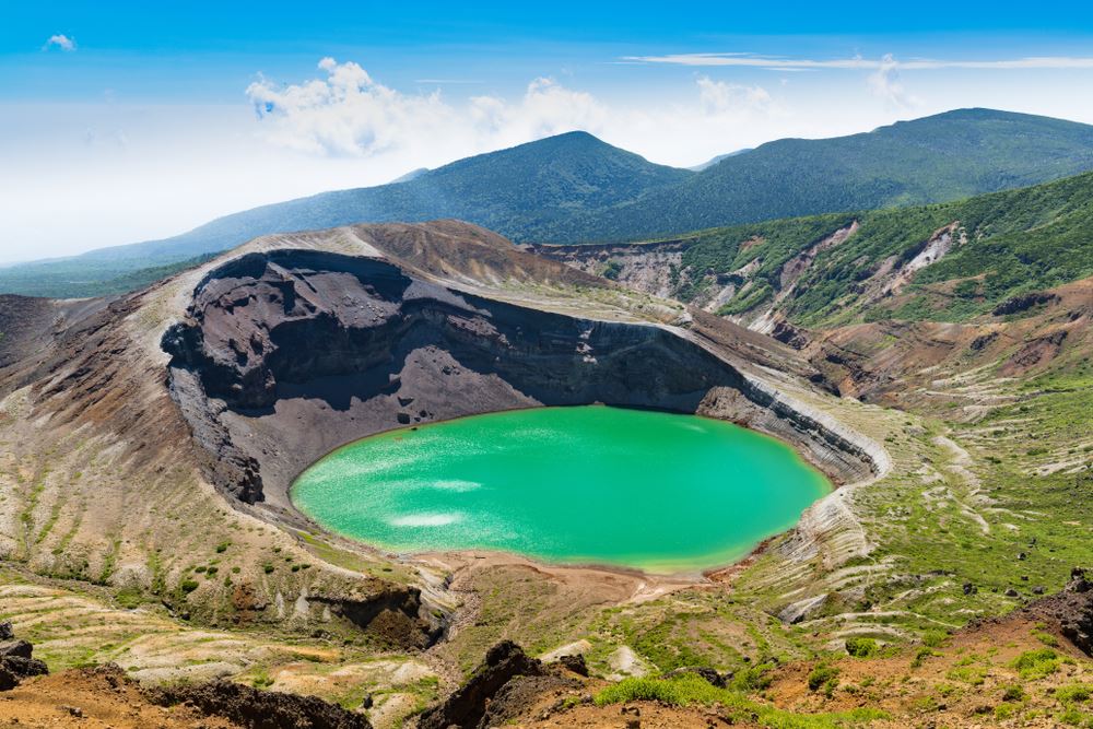 At the summit, the Okama crater hides a majestic lake called "the lake with five colours", changing throughout the day depending on the light.