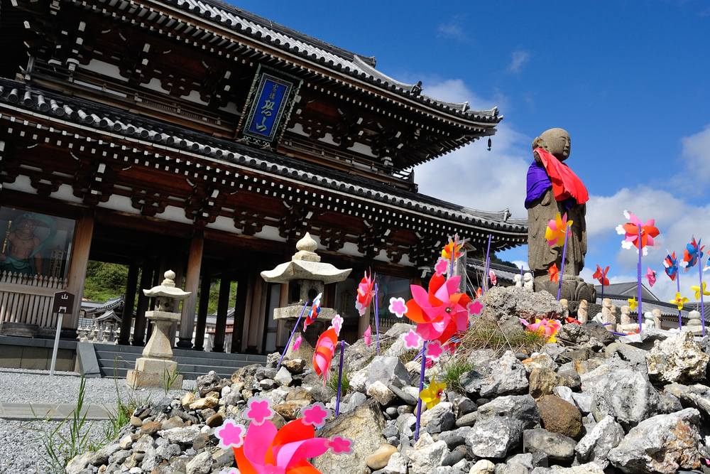 Windmill toys under a sculpture of Jizo, as a gift to the deads
