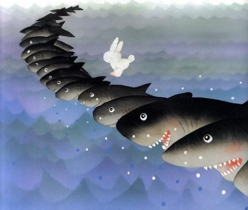 "Hop and hop": while counting the sharks, the rabbit crossed the sea where a path of scales has formed.